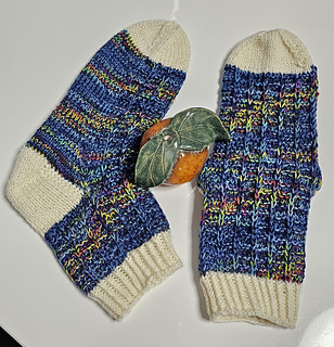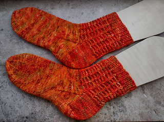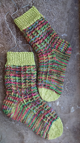 Windows ist eine Anleitung für Socken in acht Größen. Das Strukturmuster erinnert an kleine Fenster, daher der Name. Das Muster setzt sich nach der Ferse an der Oberseite des Fußes fort. Es wird eine verstärkte Ferse mit Hebemaschen gearbeitet.
