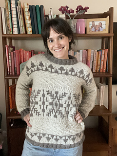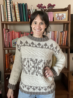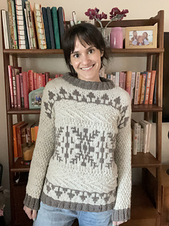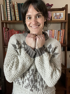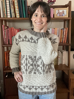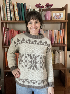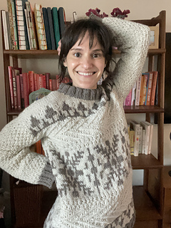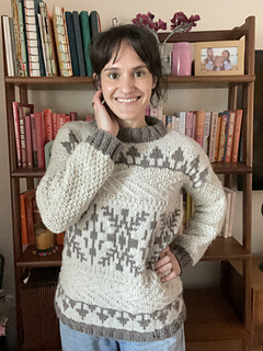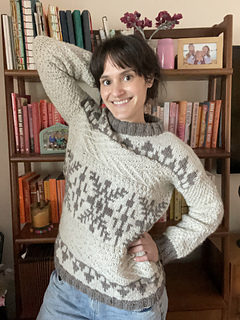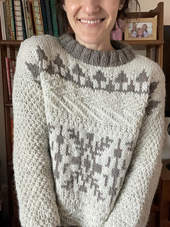 Windshore is a cozy winter sweater perfect for snuggling up in during a snowstorm!The body features a fun mix of texture, colorwork, and wrapped stitches, making for a super fun, engaging knit. Sleeves are worked in textured moss stitch with ribbed cuffs. The drop shoulder and boxy shape make for an easy oversized fit. Knit up in Bare Naked Wools Kent Aran yarn on larger needles, Windshore knits up quick and is just as fun to knit as it is to show off and wear!