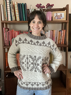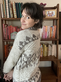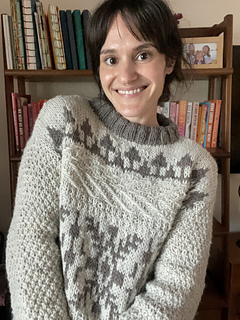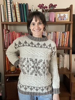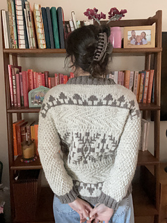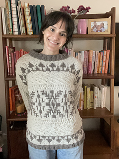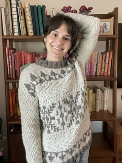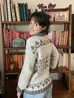 The front and back of Windshore are knit flat in pieces and feature short row shaping in the shoulders. The shoulders are seamed together using the horizontal seaming method, and the sides are seamed using the mattress stitch. The sleeves are picked up from the body and worked in the round.