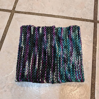 The cowl is worked flat and the ends are sewn together to create a tube shape which is pulled over the head to wear. Simple garter stitch and bulky yarn means it works up quickly and is a suitable project for beginning knitters.