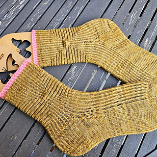 Das Muster basiert auf einem einfachen 1 Masche rechts /1 Masche links-Rippenmuster. Die Rippen treten besonders plastisch hervor, da die rechten Maschen rechts verschränkt gestrickt werden. Ein einfacher, regelmäßiger Mustersatz lässt das Rautenmuster entstehen. Ein kleiner Knopf betont den Kreuzpunkt. Mit etwas Strickerfahrung kann dieses Modell für jede Sockengröße angepasst werden.