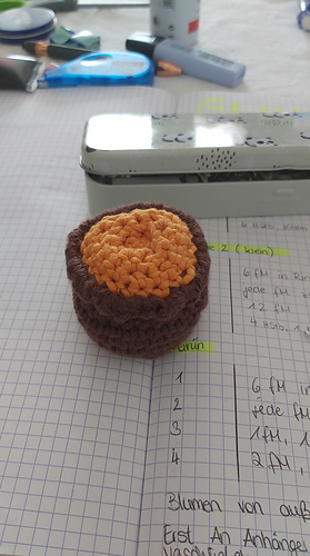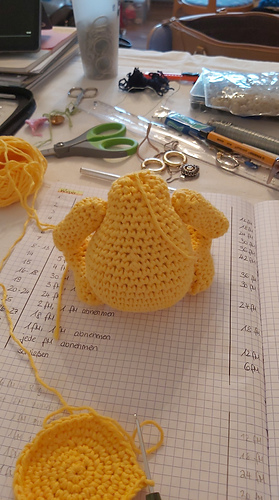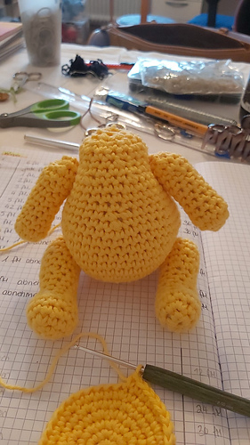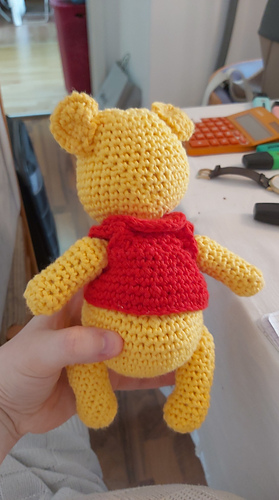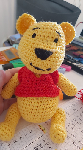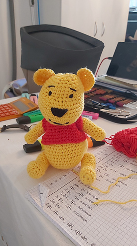 Winnie Pooh kann sich komplett bewegen, er hat Gelenke. In der Anleitung wird außerdem erklärt, wie man die Körperteile annäht, damit sie sich bewegen können. Sitzend ist er ca. 20 cm hoch.