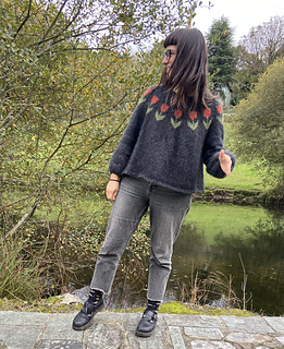 ’Winter Bulbs Sweater’ is an easy pattern to practice colorwork. It’s inspired by my tulip garden that I plant and nurture every autumn and winter. It’s knitted in the round with circular needles and you never work with more than 2 colors at the same time, making it very easy to follow. It has a romantic look, totally wearable, an uber-comby fit for an everyday look.