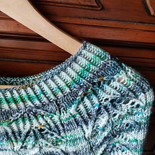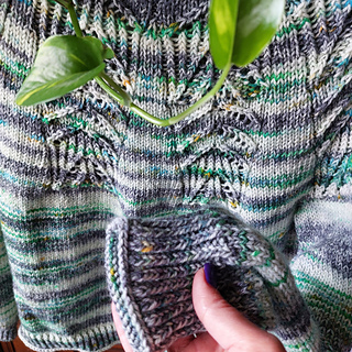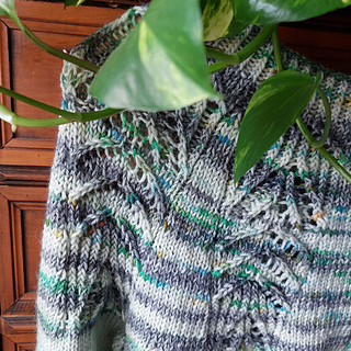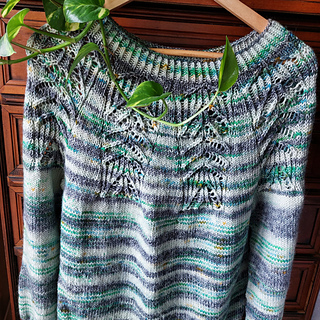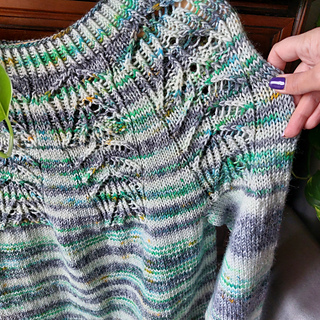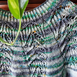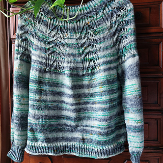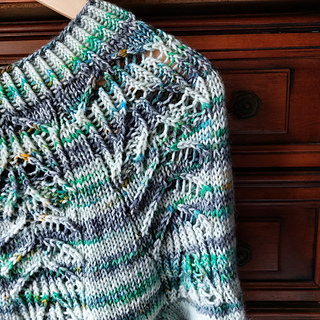 Knitted top down sweater with lace st. Sweater is knitted with Dropsdesign Flora yarns.