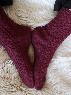 The Winter Rose Socks are knitted socks with a simple braided cable pattern. The socks are worked from the cuff down toward the toe, and the heel is shaped as a strong heel: first with gusset increases on each side of the sock while the cable pattern continues all the way down over the heel.