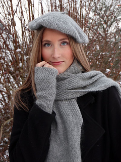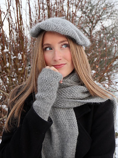 The Winter Tale Set – scarf, beret and fingerless mittens – is a lovely collection featuring a modern Parisian-style beret, fingerless mittens with a thumb, and a long, soft scarf — all knitted in the beautiful reversible Moss Stitch with delicate ribbed edges. Each pattern has a different level of difficulty.