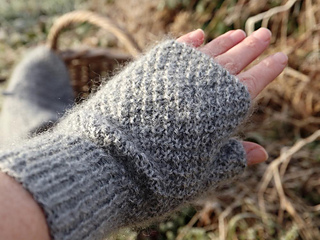 A pair of well-fitting fingerless mitts with free fingers. The mitts are knitted with a thumb and a long ribbed cuff at the bottom to keep the wrists warm. They are a pair of modern, open mitts with a light and elegant, Parisian-inspired look.