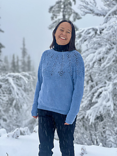 Winter Waves is knit in the round, from the bottom up. First, the body and sleeves are completed in the round up to the underarms. The body and sleeves are then joined together and the yoke is then completed, also in the round.