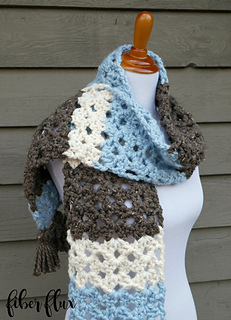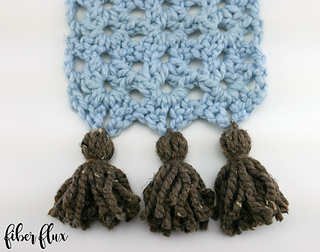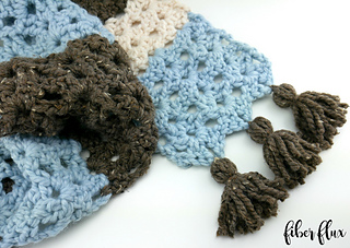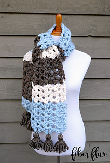 The Winter Woods Scarf is a modern chunky scarf with fun tassels at each end. Wintry tweed is blended with cool icy blue and snowy white to celebrate the winter landscape. Worked up in an easy peasy lace stitch, it is a super fast project too!