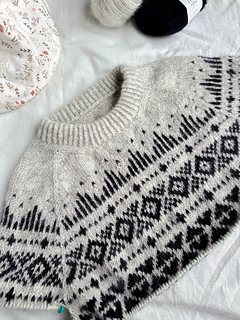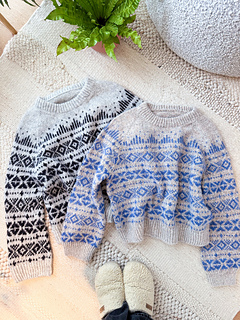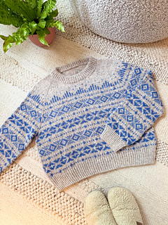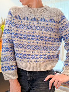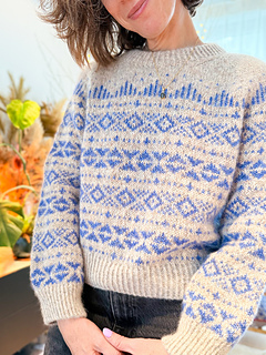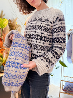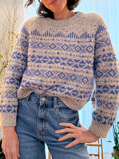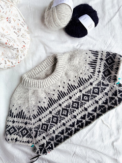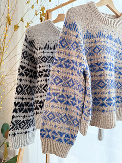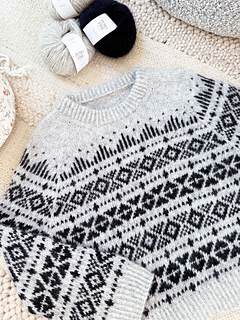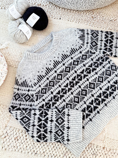 The Wintersoul Sweater is a beautifully crafted colourwork raglan featuring straight sleeves and a double-folded crew neck. It is knitted seamlessly from the top down, with the neckline, hem, and cuffs worked in a 1x1 twisted rib stitch. Body and sleeves are knit in stockinette stitch with striking colourwork, and the edges are finished with an elegant Italian bind-off.