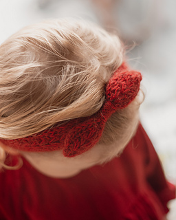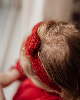 Rødt pannebånd på bildene i oppskriften er strikket i Oliva Fibers Petite Sock Set i fargen Festive Duo Nr. 1 holdt sammen med Gepard Garn Kid Seta i fargen 1006.