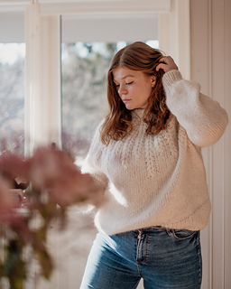 Wisteria Sweater Chunky is a wonderfully thick and soft sweater. The fit is oversized with deep armholes, balloon sleeves and of course the addictive heart-stitch pattern that adorns the yoke and which is a returning feature in several of my patterns. The sweater is quite easy to knit, but contains a couple of more advanced techniques such as Italian bind-off and shortrows. The pattern should be manageable even for a relatively new knitter who is willing to try new methods.