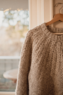 Wisteria Sweater Chunky is knitted from the top down with a round yoke, where the increases are included in the pattern. After the pattern on the yoke is knitted, it is divided into sleeves and body, and then reverse rows are knitted to make the sweater higher at the neck. The body is finished with wide rib, double knit and Italian bind-off. The sleeves are knitted with increases to give a slight balloon effect before being reduced to narrow rib around the wrist. This gives a nice effect and makes it easy to roll up the sleeves of the sweater when needed. The ribbed edges on the sleeves are also finished with double knitting and Italian bind-off.