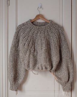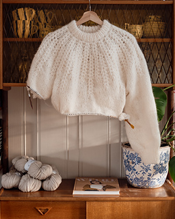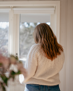 The gray sweater in the pictures in the pattern is knitted in Isager Eco Soft in the color E2S together with CaMaRose Målestråle in the color 9004 Askegrå. The white sweater is knitted in Drops Air together with Drops Kid Silk, both in the color 01 Natur.