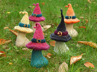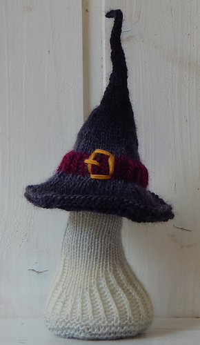 Our “Witch’s Mushroom” is knitted in the round and in one piece. There’s no need to sew anything together. It’s quick and easy to knit. A trick allows the mushroom to stand upright. You can use different yarn weights to knit witch’s mushrooms of different sizes.