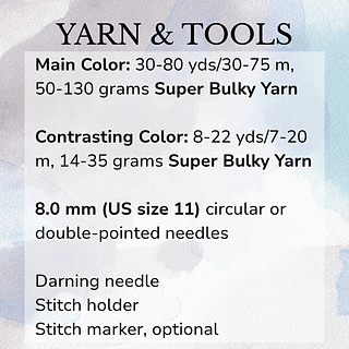 Contrasting Color: (8, 10, 13) (15, 15, 22) yds / (7, 9, 12) (14, 14, 20) m, (14, 17, 22) (23, 23, 35) grams Super Bulky Yarn