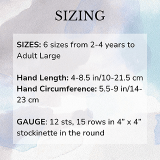 Mitten Length: (6.5, 8, 8.5) (9, 10.5, 12) in / (16, 20, 21) (22, 27, 30) cm