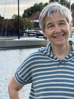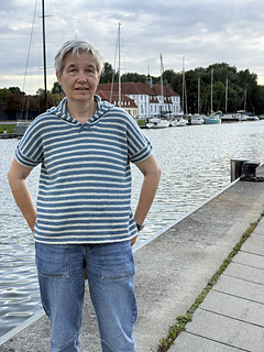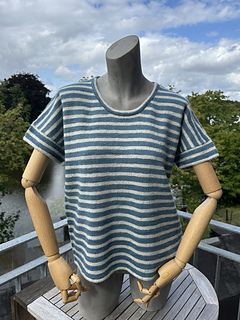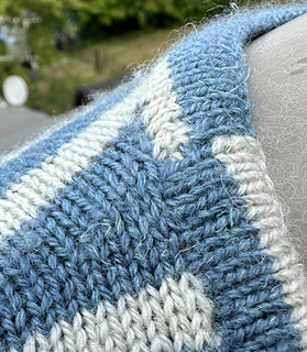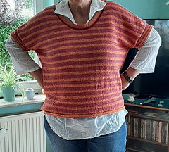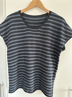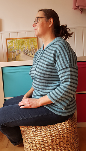 The sweater itself is worked top-down in stripes, with 2 different stripe sizes. Stitches are picked up around the armholes, and the sleeves are worked top-down to desired length: I have chosen short sleeves for the sample, but the pattern also includes hints how to work a long-sleeve version.
