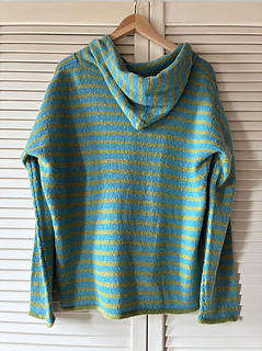 The hood is started by picking up stitches around the neck, working in short rows to fill up the deeper front neck, and then worked bottom-up in stripes to its crown, ending with a 3-needle-bindoff.