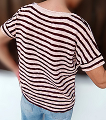 The sweater itself is worked top-down in stripes, with 2 different stripe sizes. Stitches are picked up around the armholes, and the sleeves are worked top-down to desired length: I have chosen short sleeves for the sample, but the pattern also includes hints how to work a long-sleeve version.