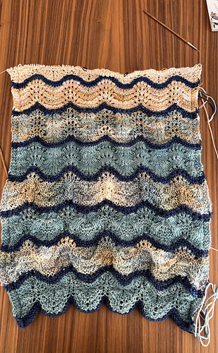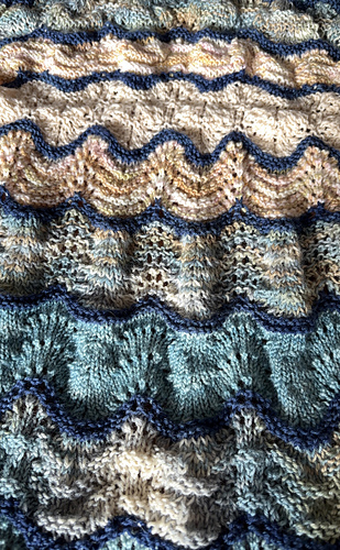 Then, in June and July, the pain eased just enough for me to pick up my needles again. I took the opportunity to start this shawl — its simple back-and-forth stripes made it possible to work slowly, just one row at a time, depending on how my hands felt.