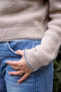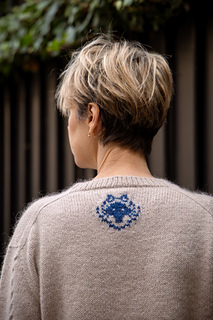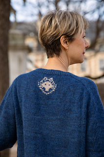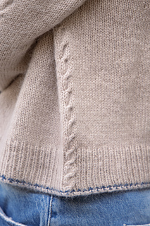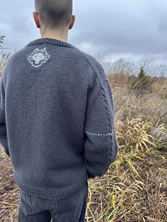 Wolfie has a small wolf head at the upper back, a pretty and unconventional cable running along the sides and on the back of the sleeves, and a delicate touch of the contrast colour just before the edge of the hem and sleeve ribbing.