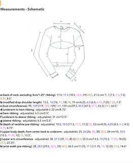 Wolfie is designed to be worn with 15 cm/6“ to 25 cm/10“ of positive ease. If you have a petite frame compared to your bust circumference, I recommend going for a measurement closer to 15 cm/6“ positive ease and envisaging the optional horizontal bust darts.