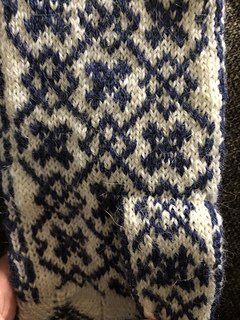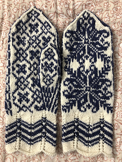 This mitten uses traditional Selbu motifs, including the chevron cuff used in women’s traditional styles.