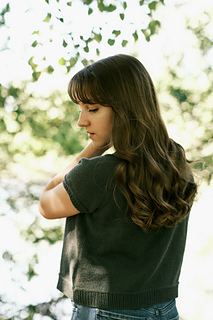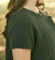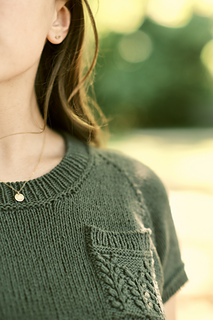 The Woodland Tee is worked using a cotton merino wool blend yarn that’s perfect for the transition into cooler weather. It has a slightly cropped body and short sleeves. It also has a decorative faux seam along the sides and an optional front pocket. It is knit up using a light fingering weight yarn held double to achieve a DK weight gauge.