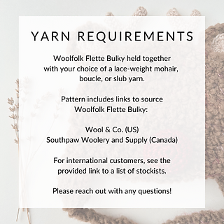 Yarn: Woolfolk Flette Bulky (48-102 yds) + maker’s choice of mohair, boucle, or slub yarn (53-114 yds)