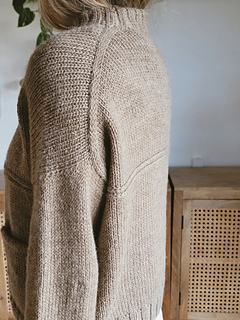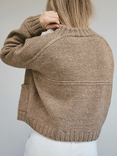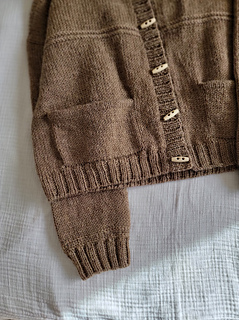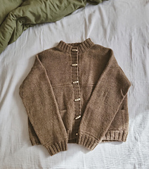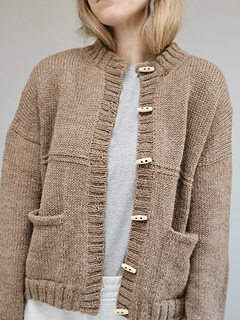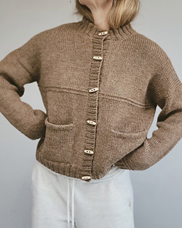 The Woods Knit Cardigan is a drop shoulder style cardigan that is constructed in one piece from the top down. The body is worked flat, and the sleeves are worked in the round. It is knit in a simple stockinette stitch for a clean look with horizontal detailing on the body and the wrists for a touch of texture. It has 2 x 2 ribbing on the bottom hem, wrist cuff and button band with an oversized fit of 7-11” 18-28cm of positive ease. The model in the pictures is wearing a size M and has a bust circumference of 35.5” 90cm. Choose the size based on the amount of positive ease you prefer.