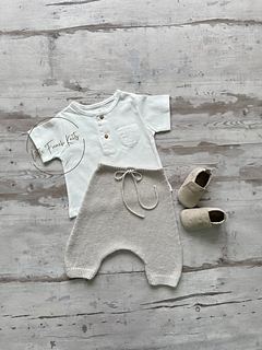 Pants are worked flat in two pieces and seamed at the sides. Legs are cast on and worked separately, then stitches are cast on between legs to work in one piece to waistband. Waistband is folded to create a casing for the I-cord drawstring.