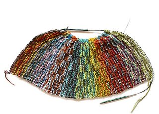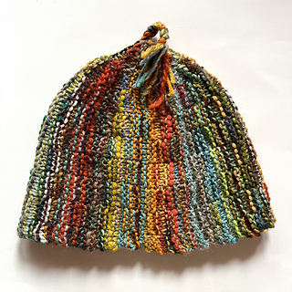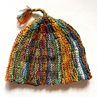 So I designed it two different ways: one that’s more similar to the scarf, using two circular needles which slide in the stitches, same as the scarf, meant for lots of quite short scraps of yarn leftovers. Then I made a variation, less similar to the scarf, meant for leftover mini-balls of yarn, which just uses one pair of needles, worked more normally. This version creates blended stripes, as you work with three colors at a time throughout.