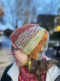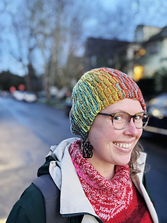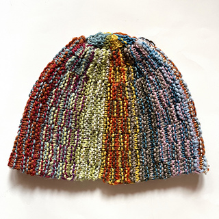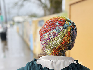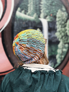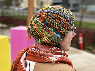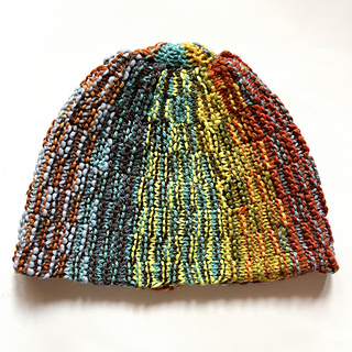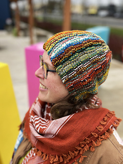 This hat concept was based my Slanted & Enchanted scarf design, which is meant for using up varying lengths of leftover scraps of yarn. The scarf is, well, slanted, because there are short rows created by some of the strands not making it to the end of the row. I realized that this concept could be turned into a hat by the narrow side becoming the crown. It couldn’t be as scrappy and freeform as the scarf though, since it needed to function as a hat, and randomly placed short rows would result in pointed crowns and wonky shapes!