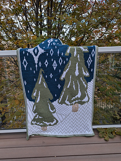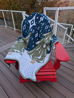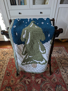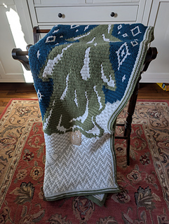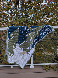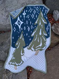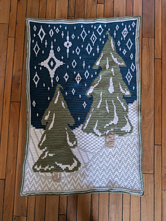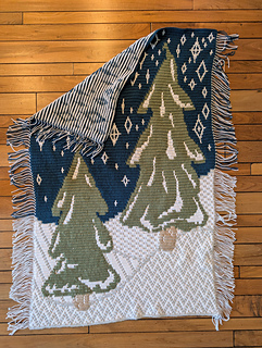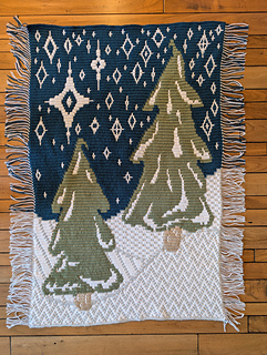 Wrentit is a cartoonish winter scene crocheted using the overlay mosaic technique. It was designed using Lion Brand Pound of Love in five colours. There are mid-row colour changes but no diagonal/slanted stitches. It can have a fringe on the vertical sides, or the ends can be enclosed with an envelope border. The finished project with the border pictured is 36” wide by 55” long. Pattern made with StitchFiddle software.