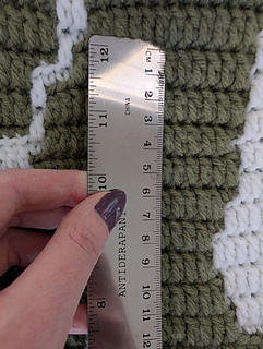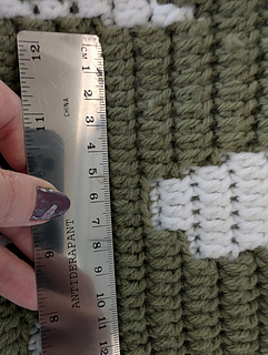 Chart and written instructions are included. Pattern is worked right to left facing RS, tying off and cutting the yarn at the end of each row. Even rows are all white. Odd rows, SC are the main colour of that row. Brown and Green BLSC will be specified. If it does not say green or brown, that means the green/brown section is over and to go back to the snow/sky colour.