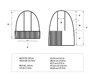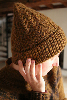 The hat is worked bottom-up in the round and features four distinct textured sections: two narrow panels that meet at the top and are joined with a three-needle bind-off, and two wider panels that gradually disappear during the crown shaping. The sizes differ in the width of the narrow panels.