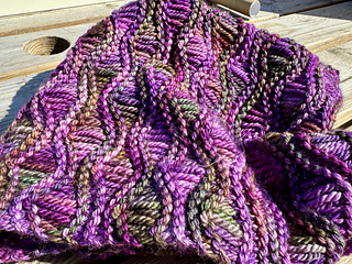 The Wynding Cowl is knitted flat, following an easy pattern resulting in a beautiful waves design. It looks gorgeous when knitted using a variegated, multicoloured aran weight yarn but it may be knitted in any weight or base.