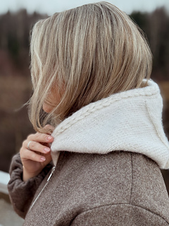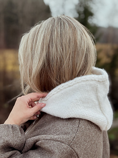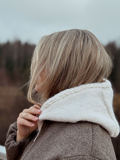 Yara_balaclava is a feminine and functional balaclava knitted top-down in stockinette stitch, with a decorative cable along the edge framing the face. It can be worn both as a balaclava and as a loose, cozy hood—perfect under a coat on cold days or as a soft, modern accessory to outerwear.