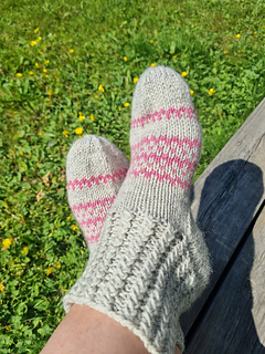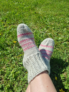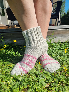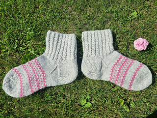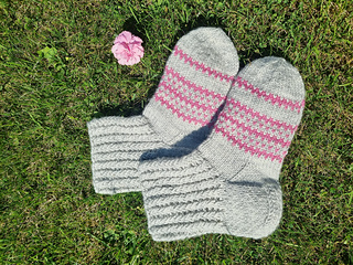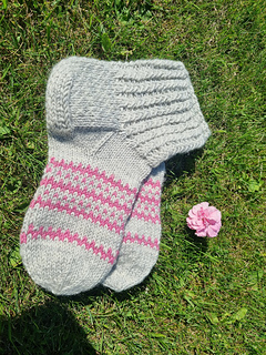 - Kuvan sukassa käytetty pohjavärinä Novitan 7veljestä vaaleanharmaa (Jäkälä 047, 100 g kerä) ja vaaleanpunainen (Karamelli 510, n.30 g). Suosittelen valitsemaan konepestävän langan.