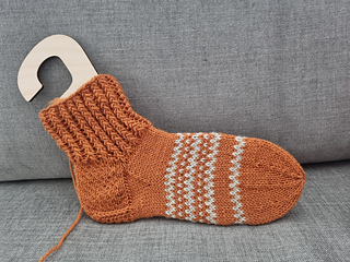 I knit mainly with wooden needles, which can affect the knitting gauge, and therefore I recommend, as with every pattern, to check your gauge by making a swatch with you needle choice or checking you gauge while knitting. Adjust the gauge with changing the needle size according to your knitting tension or change to metallic needles. But I urge you to take into consideration that knitted socks tend to widen while in use. So, keep then tight and fit.
