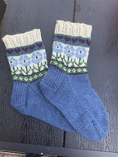 Sokkeoppskrift med motiv av blomster og hjerter. Sokkene går litt over ankel og har blomsterkant.