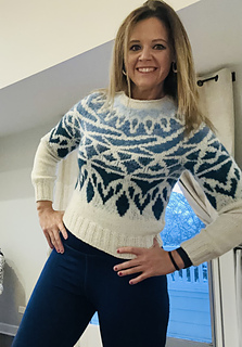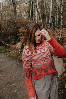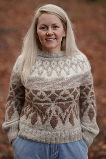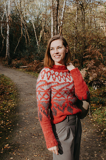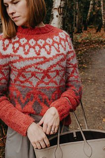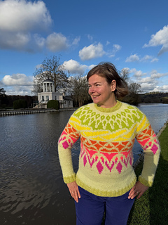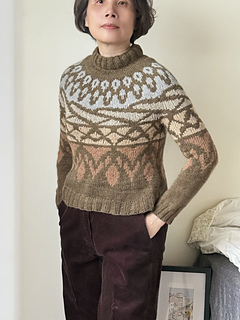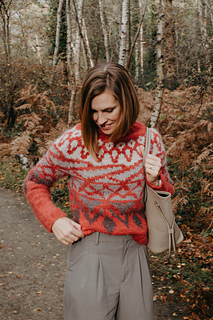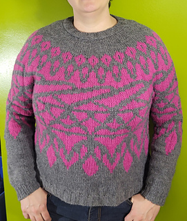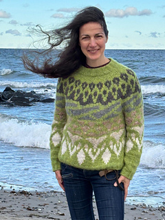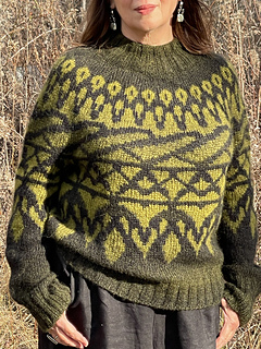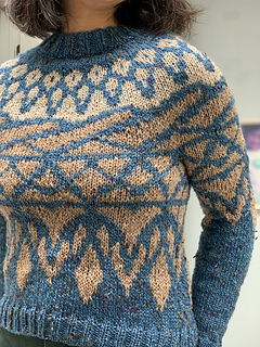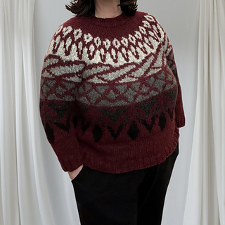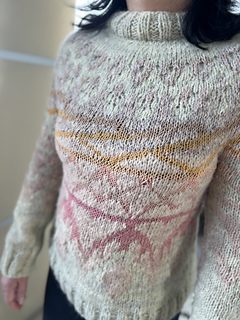 It is another round yoke stranded colourwork sweater, worked seamlessly from the top down, with the colourwork extending deeply past the sleeve separations. The design continues the theme of finding calm and creative flow through knitting colourwork, inspired by the art of Buddhist mandalas.