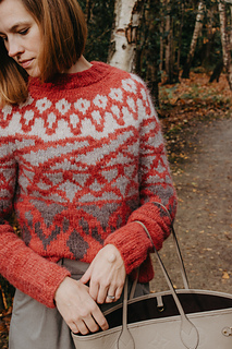 Yarns used in sample (size 2) are 12 skeins of Shangdrok Cloudy Alpaca (33% Super Fine Alpaca, 34% Baby Alpaca, 33% Wool; 75 m 82 yds / 50 g): 8 skeins of colourway Red Envelope as Main Colour (MC) and 1 skein of each colourway in gradient set Biting Lips for A Minute (5 colours) as Contrast Colour (CC).