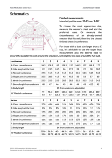 - 37¾ (43½, 46¾, 51½, 54¾, 59½, 62¾, 67½, 70¾)” Designed to be worn with 20-25 cm / 8-10” positive ease around the chest.