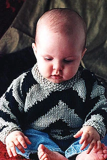 Style is a pullover with buttoned opening on left shoulder. Colorwork is charted.