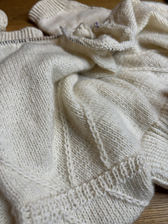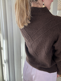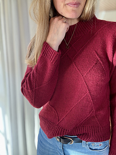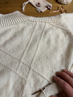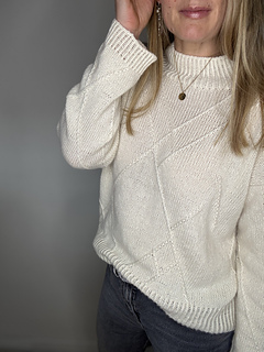 The sweater is worked from the top down. First, cast on stitches for the back, then work flat with short rows to shape the upper back while knitting the pattern. Next, stitches are picked up for the right and left shoulder, which are worked separately. The shoulders are joined to form the front by casting on new stitches in center front. The front and back are then joined while casting on stitches under the arm. The body is finished with a twisted rib hem. The sleeve stitches are picked up, the pattern from the front and back and along the sides of the body are extended onto the sleeve. Decreases are worked along the sleeve underside. The sleeve is finished with a twisted rib cuff.