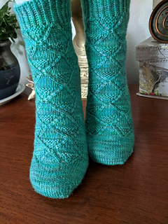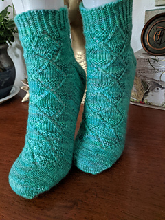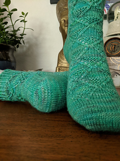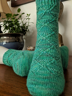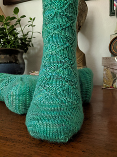Zenity socks are a toe up magic loop pattern with a wedge toe and heel flap construction. Both written and charted instructions are provided.