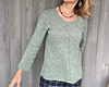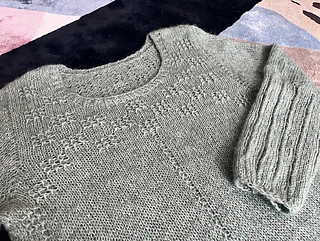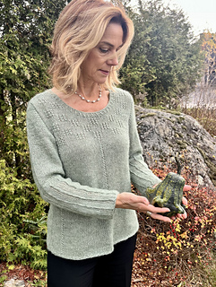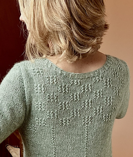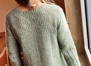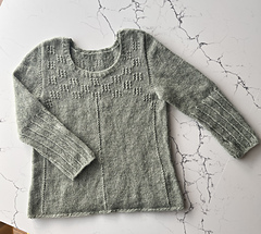 Knitted in the round from the bottom up to the armholes, the front and back are then worked flat for clean shoulder shaping. The sleeves, knitted in the round from the top down, pick up the vertical lines from the forearm to the wrist — an elegant continuity that unifies the piece from shoulder to cuff.