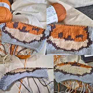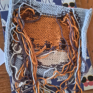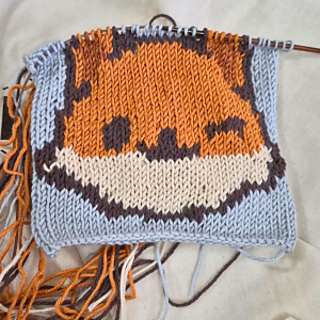 Para tejer el dibujo de zorrito con Intarsia necesitas trabajar cada bloque de color con su propia hebra, cruzando los hilos en cada cambio para que no queden agujeros.